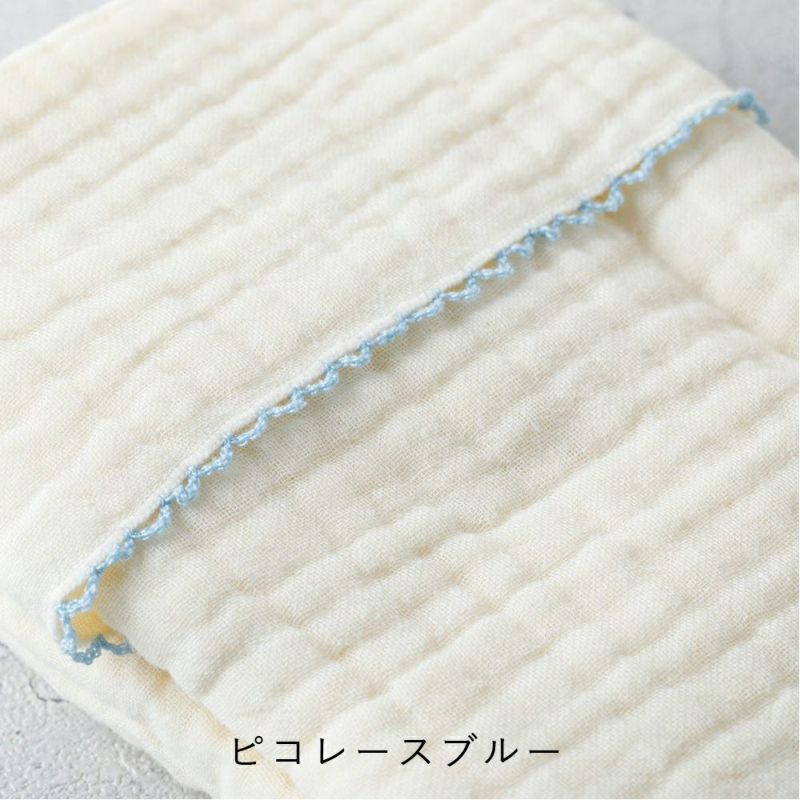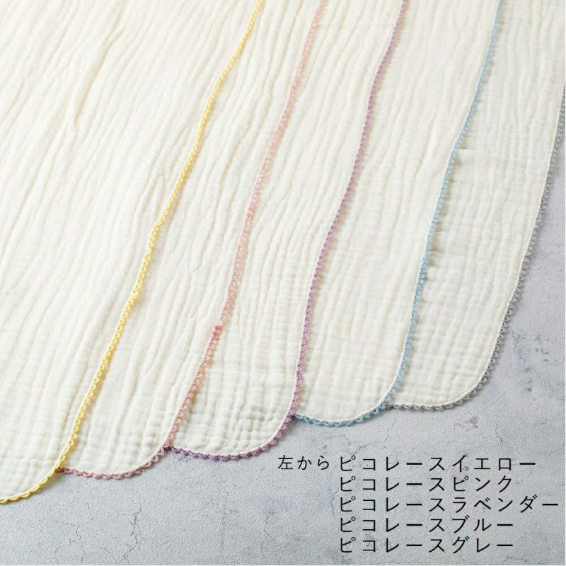 シワ感のある生地がナチュラルな無地カラー×ピコレースのカラーでとっても使いやすいデザイン♪赤ちゃんを優しく包んで「おくるみ」としてはもちろん、お風呂のあとの「湯上りタオル」などマルチに大活躍します。