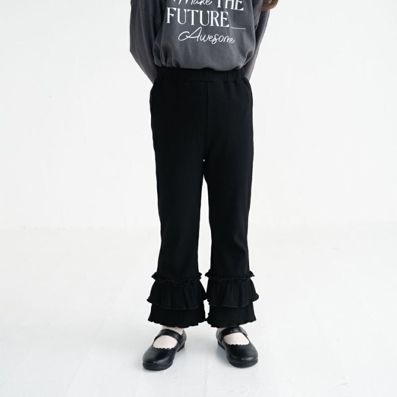 裾のフリルがかわいい♡フレアパンツ。伸縮性のある生地で動きやすく、デイリーにもお出かけにもおすすめです♪