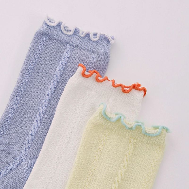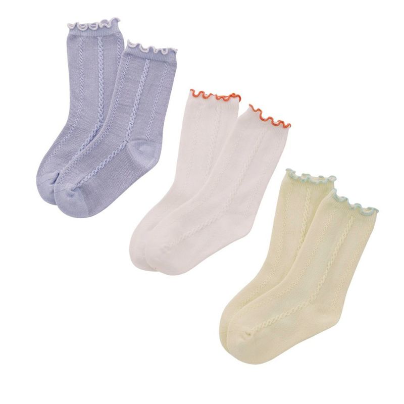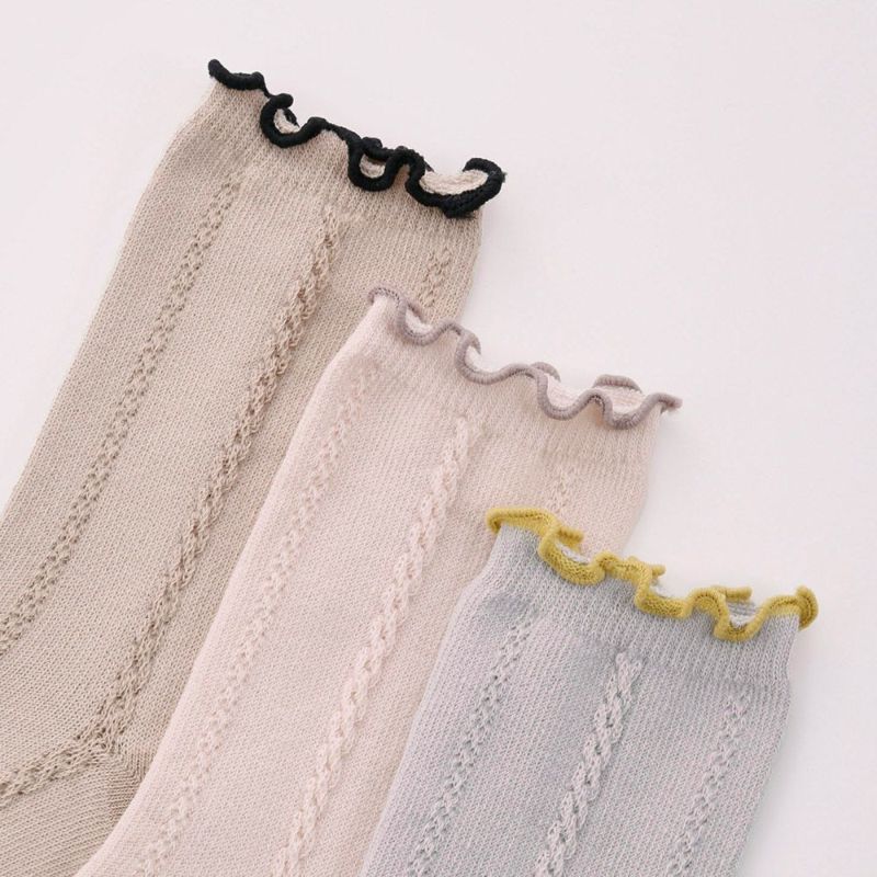 レース模様のようなストライプ柄の編地変化、足口のメロウ配色デザインが可愛い3Pセットのクルーソックス。