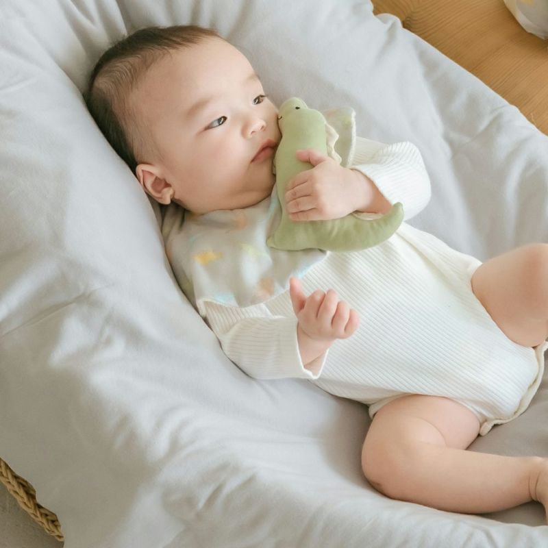 オーガニック生地を使用しており、まだまだ手のコントロールが上手ではない低月齢の赤ちゃんもそっと渡せるやわらかな素材です。