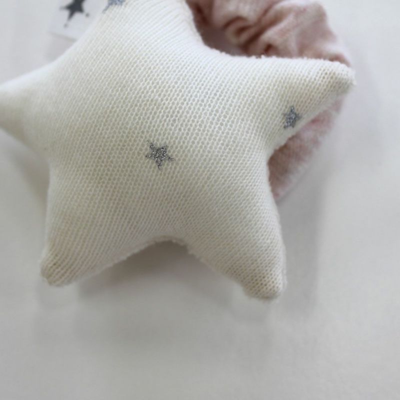 生まれたばかりのデリケートな赤ちゃんの柔らかい肌に直接ふれるものだから、素材選びからこだわってつくられたラトルです。 吊編機を使って生産される伝統素材「吊天竺」を使用。通常と比べ同じ長さを編むのに15~20倍の時間をかけてゆっくり生産されます。空気をたっぷり含み、さらにオーガニックコットン100%使用手に通すことができ、赤ちゃんが手を動かすたびにやさしい鈴の音が鳴ります。