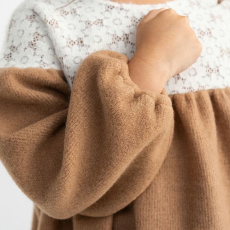 モヘアニット切替が人気のギャザードッキングワンピース。ぽわんとした袖とギャザースカートが女の子らしさを感じるデザイン♪起毛レース×モヘアニット素材がシーズンムードを盛り上げてくれます♪両脇にポケットを備えているので実用性も◎
