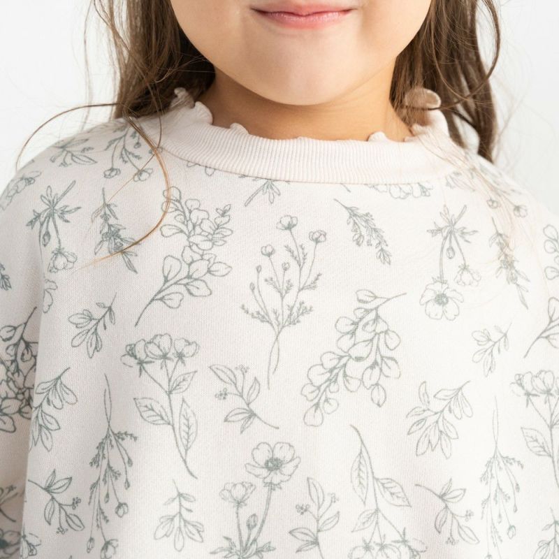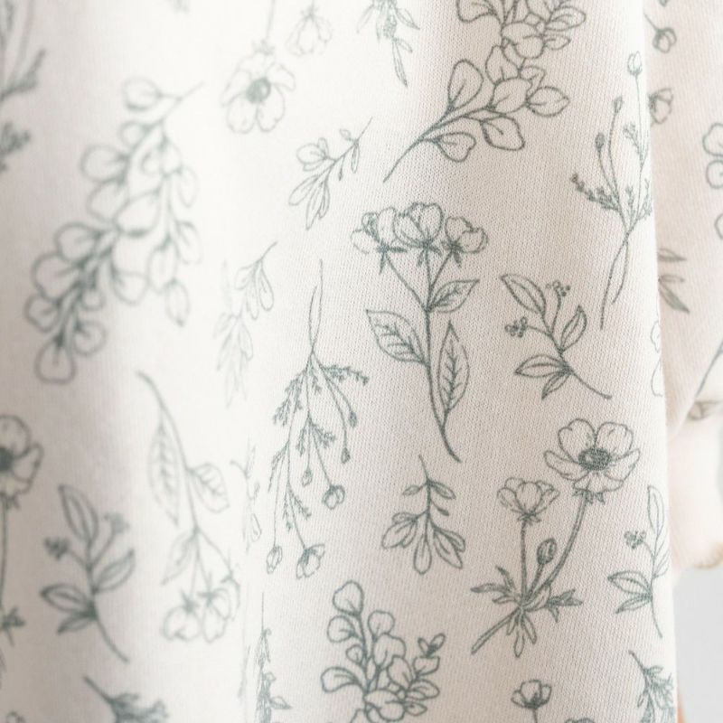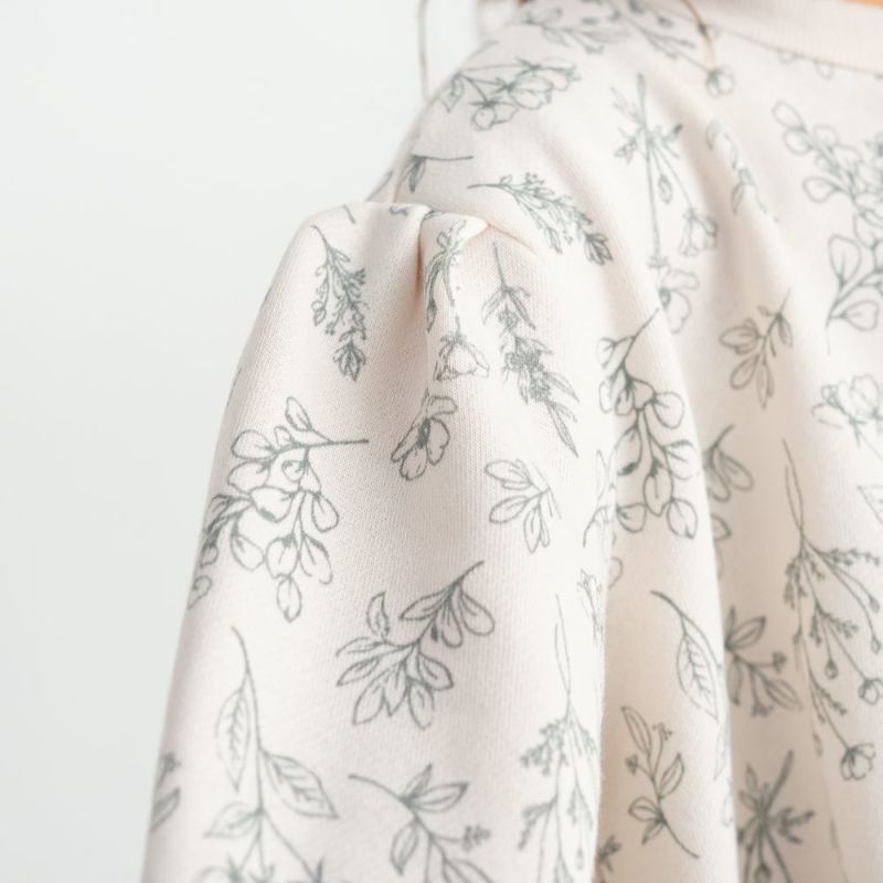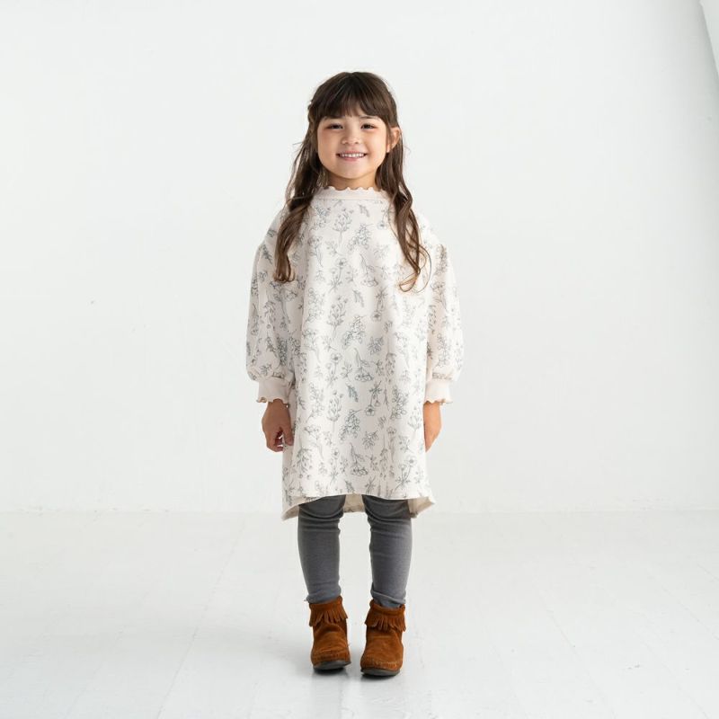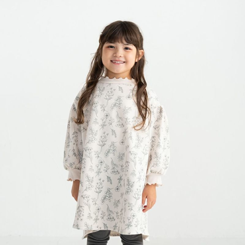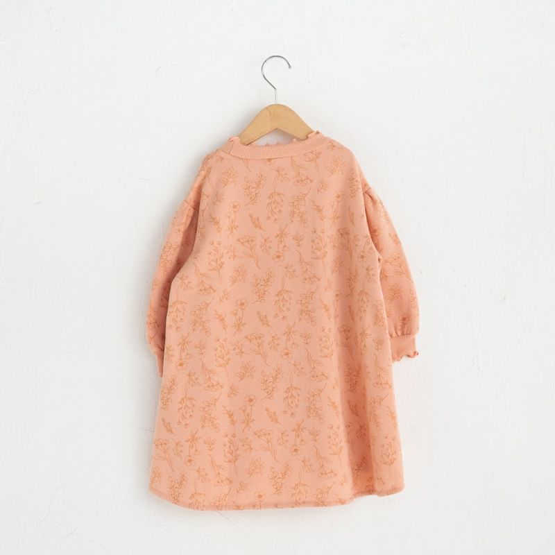 実用性の高いトレーナーワンピースにボタニカル花柄をあしらい、デイリーに使いたいワンピースが完成!お顔周りと袖口はメローフリルで飾って愛らしい装いに。裏毛起毛なので1枚であったか♡前後差のある技ありへムが抜け感を演出!