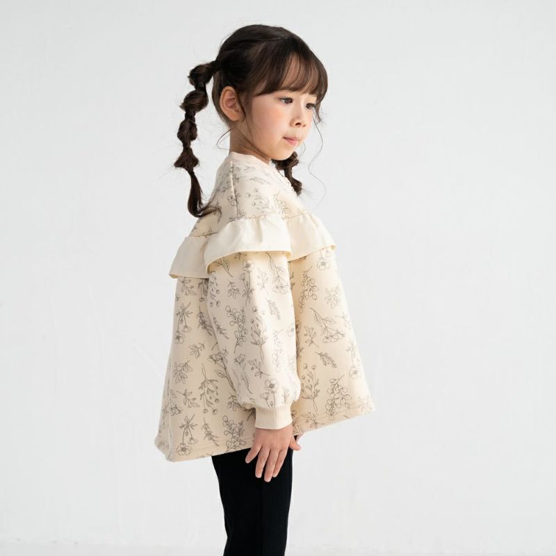 ラウンドヨークにあしらった異素材フリルがさりげなく女の子らしさを演出。裏毛起毛素材であたたかく、袖ロはリブ仕様で風を通しにくいのも嬉しいポイント。通園通学やお出かけにびったりな、デザイン性と機能性を両立した1着です。