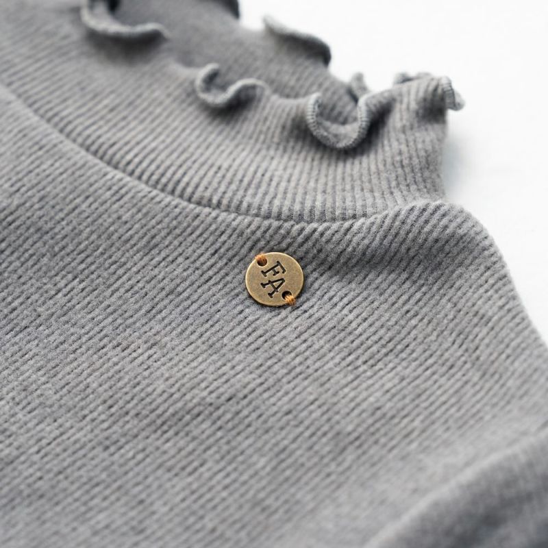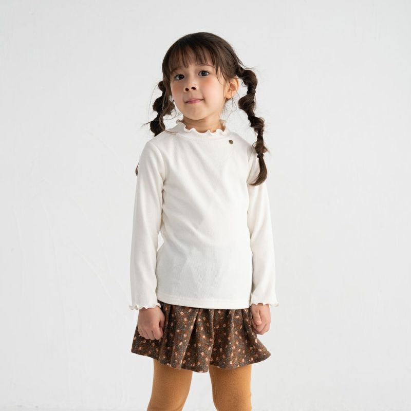 ほんのり起毛したやわらかリブ素材ですっきりシルエットなのに暖かい、秋冬コーデの名わき役♪着回し力バツグンで胸元のチャームがアクセントをプラス!袖口や衿ぐりのメローフリルがさりげない可愛さを演出してくれます。