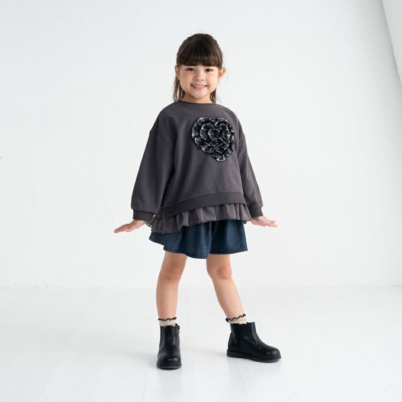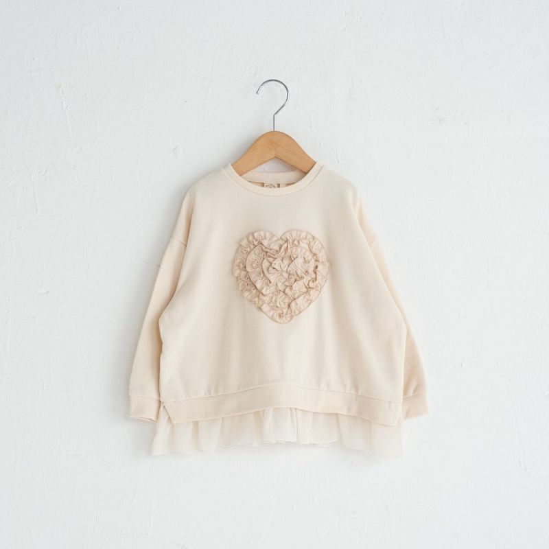 ゆるっとかわいく着るだけでおしゃれ見え。ドロップショルダー×ワイドシルエットで今年らしい抜け感をプラス。胸元にはフリルハートアップリケをオン♪裾には透け感のあるシフォンフリルをドッキングし軽い印象に仕上げました。
