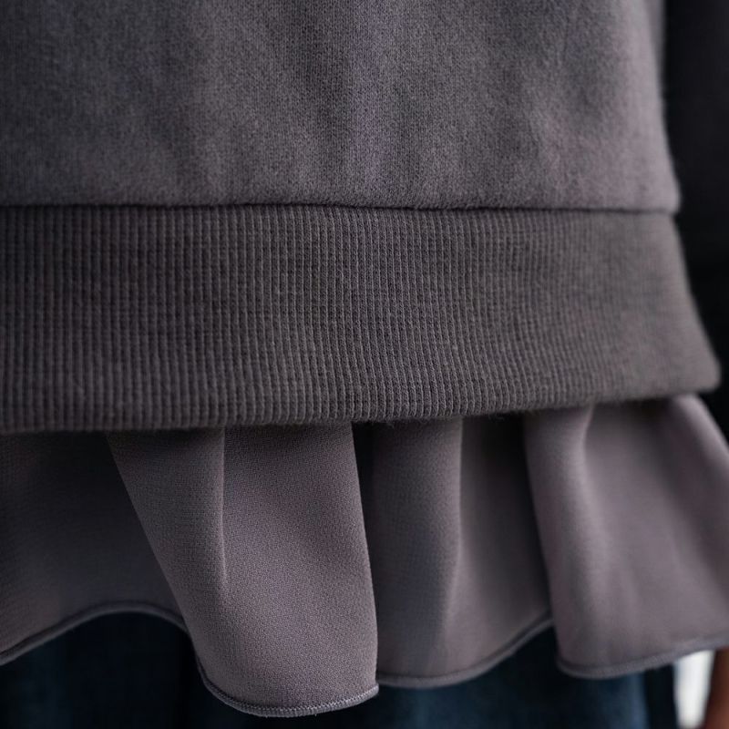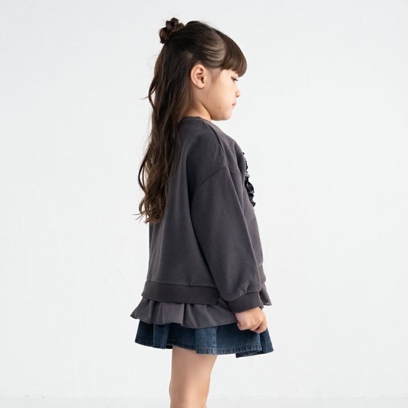 【チャコールグレー】本体:綿100%、リブ:綿95%ポリウレタン5%、アップリケ:ポリエステル72%レーヨン25%ポリウレタン3%、裾フリル:ポリエステル100%