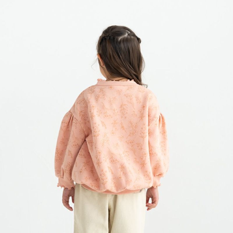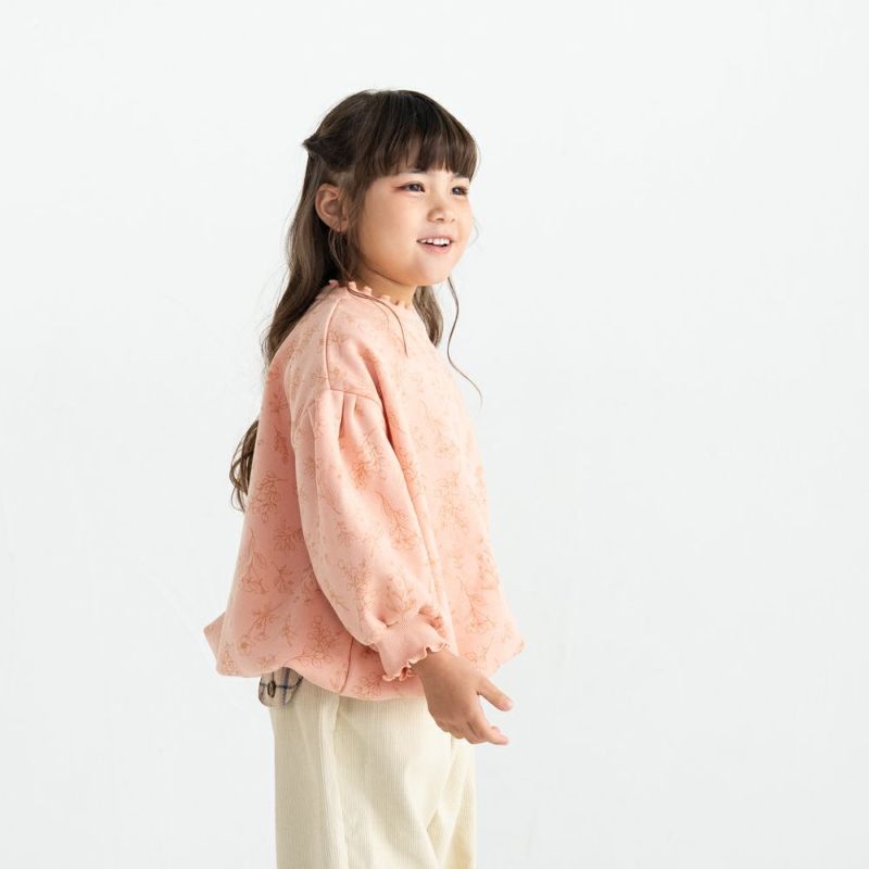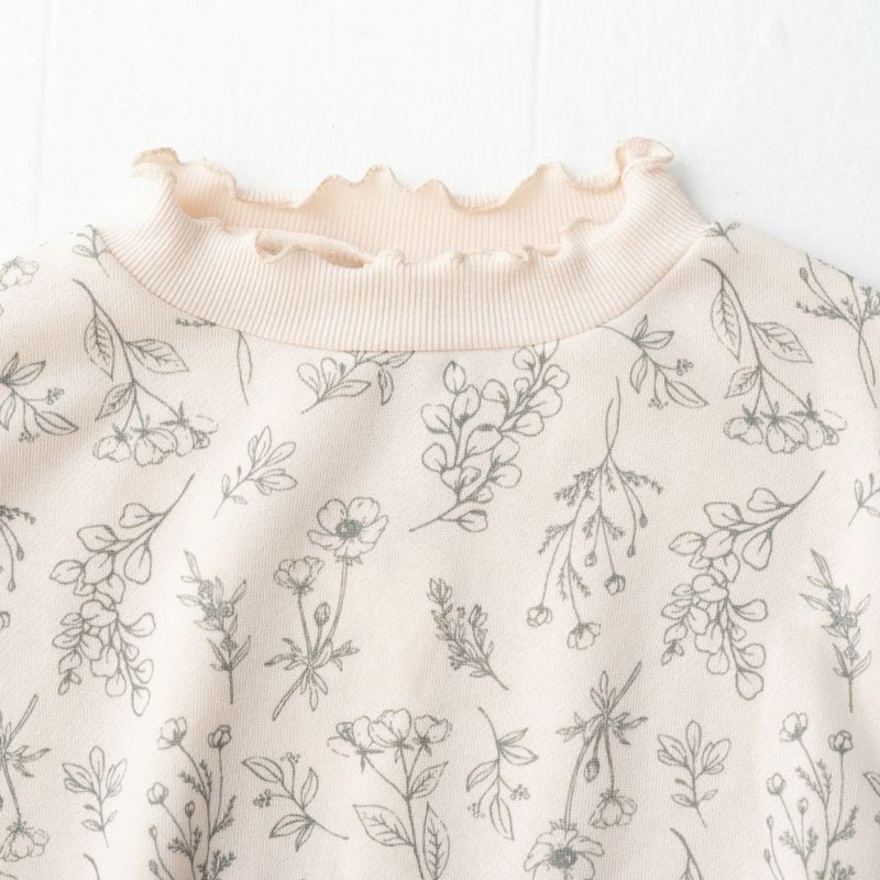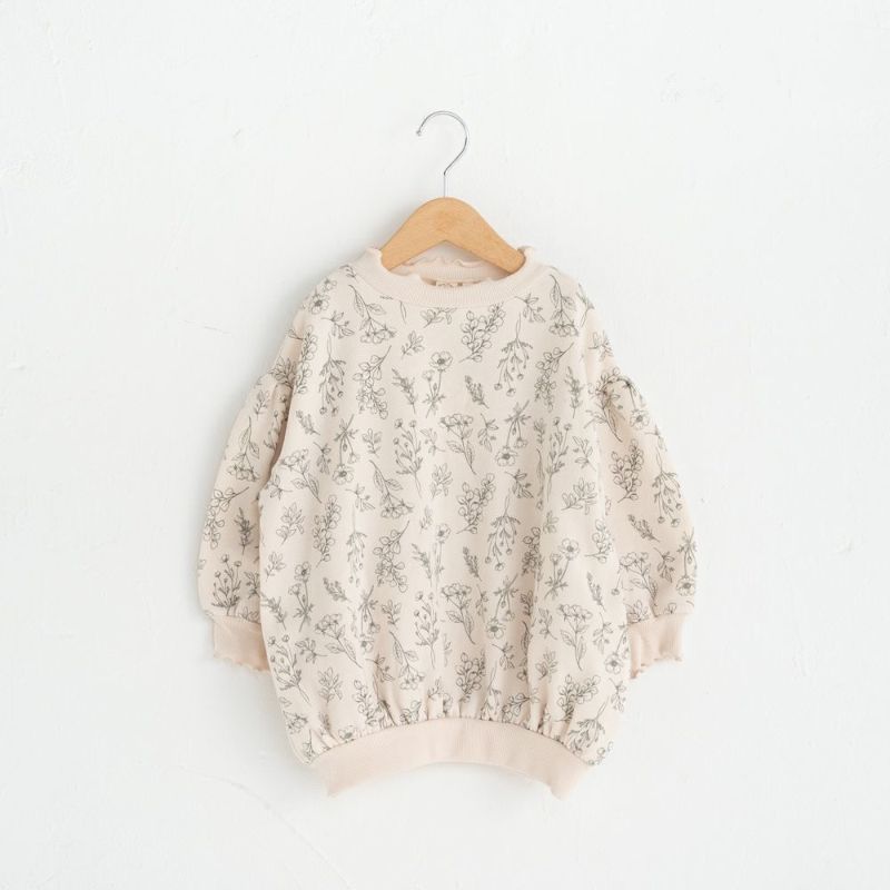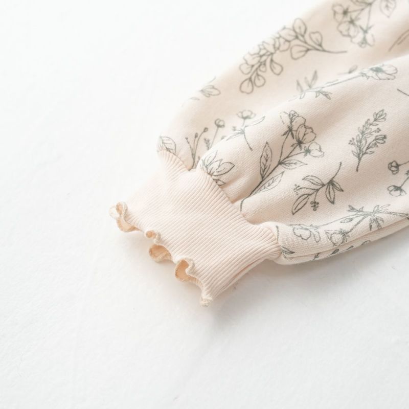 袖口や衿ぐりのリブにメローを施しスイートに仕上げました。あたたかな裏毛起毛のボディーにはオリジナルのボタニカル柄をプリント♪ボリュームを持たせたシルエットはリブ部分にキュッとギャザーを寄せてふんわり仕上げました。