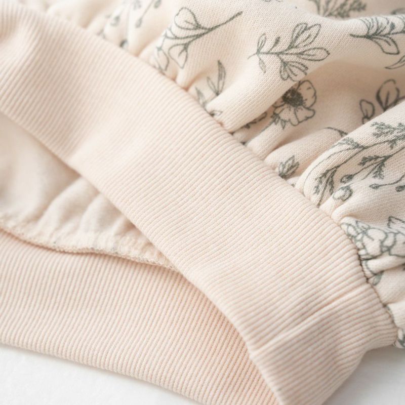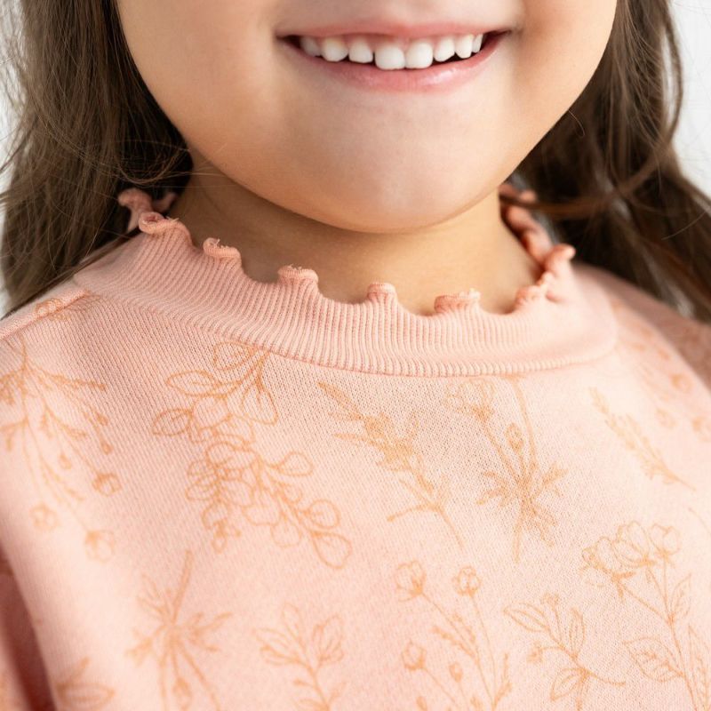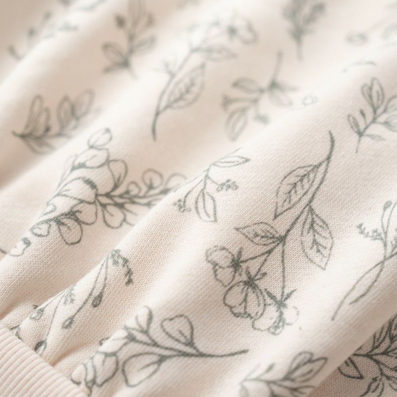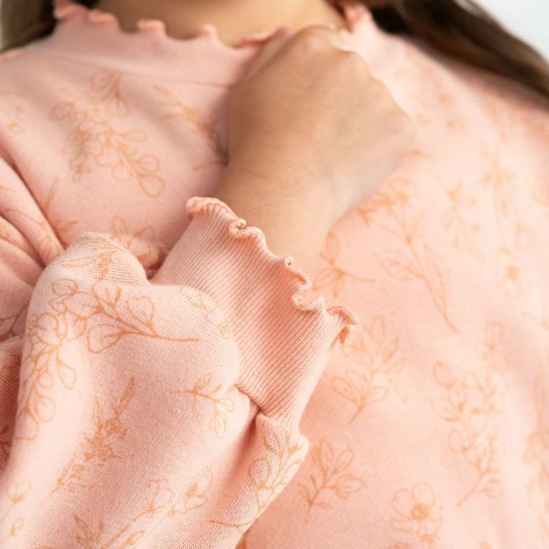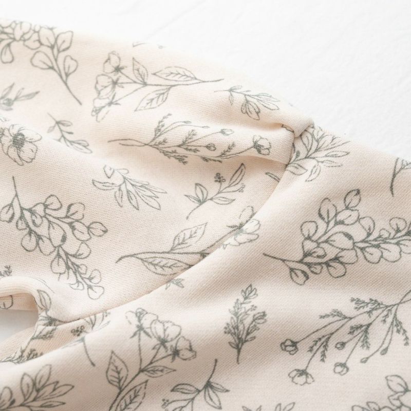 袖口や衿ぐりのリブにメローを施しスイートに仕上げました。あたたかな裏毛起毛のボディーにはオリジナルのボタニカル柄をプリント♪ボリュームを持たせたシルエットはリブ部分にキュッとギャザーを寄せてふんわり仕上げました。