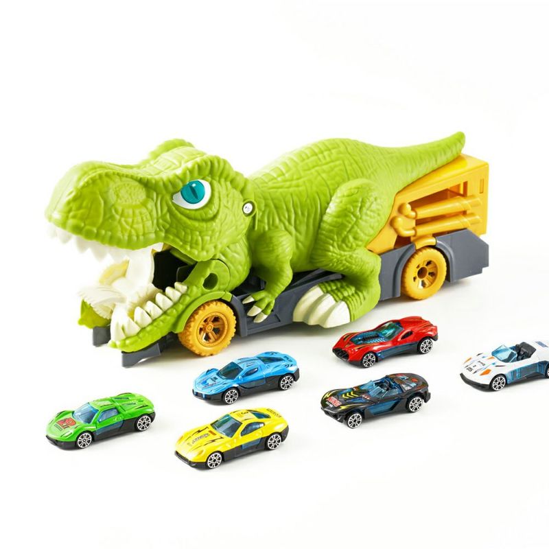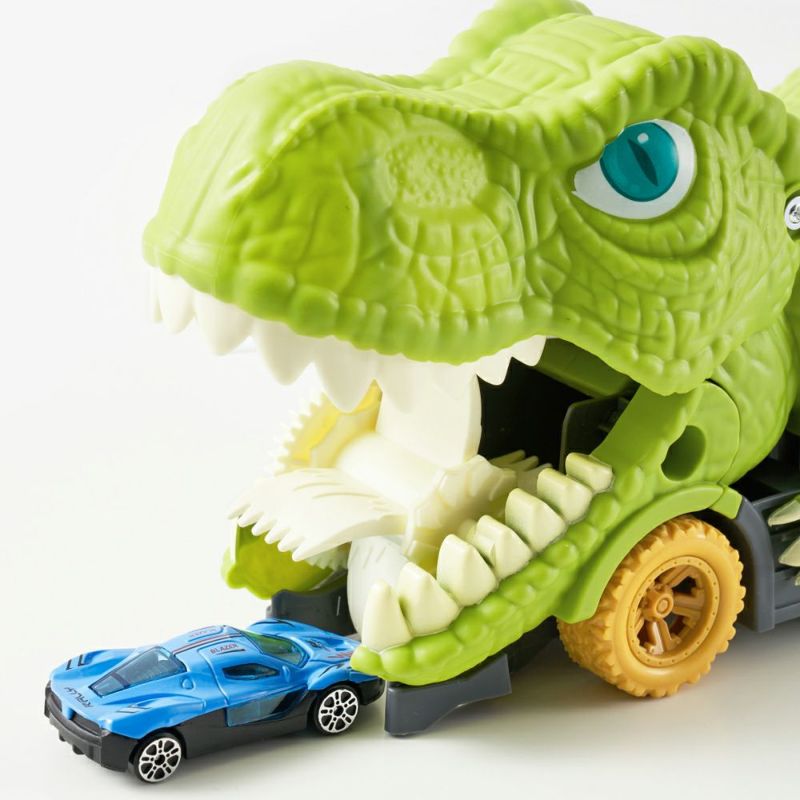 走るティラノに食べられたミニカーがしっぽの下からピョーンと出てくる!