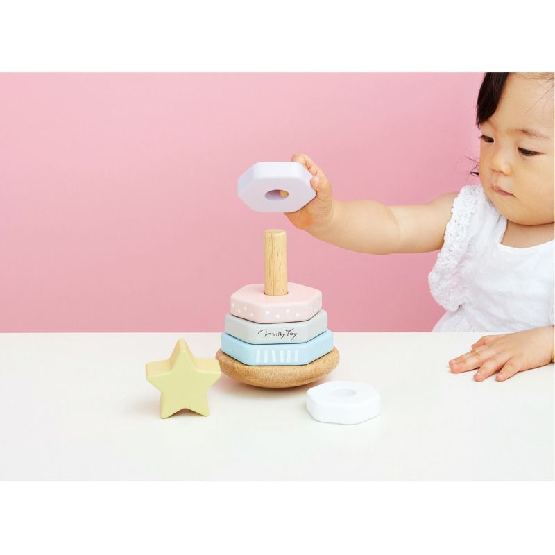 六角形のリングを積んだり、外したりするほか、大きさくらべやリングの穴をのぞいてみたり。