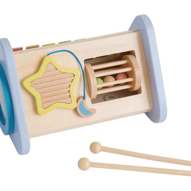 鉄琴・ドラムを「たたく」、ラトル・歯車を「回す」、ギロを「こする」という動作から音が出る楽しさを自分で発見し、音の違いも自然に理解していきます。