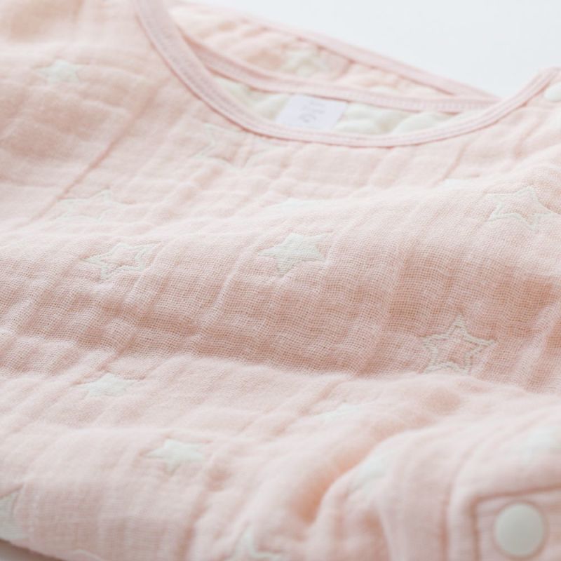 左肩と両脇をスナップで留めるタイプなので、眠ってしまった赤ちゃんに着せてあげるのも簡単です。寒い冬の夜だけでなく、夏の冷房対策としてやお昼寝の時などにも使える便利なアイテムです。オリジナルデザインの星柄は、ピンクとブルーの2種類。丁寧に作られた日本製で、大切な方への贈り物にもおススメです。