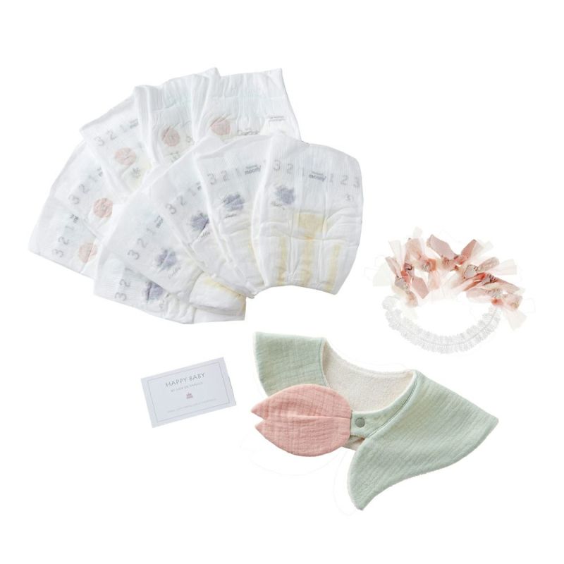 Lien de familleのおむつケーキは過剰包装をせず、シンプルで素材や機能性にこだわった「もらって嬉しい」アイテムを取り合わせました。