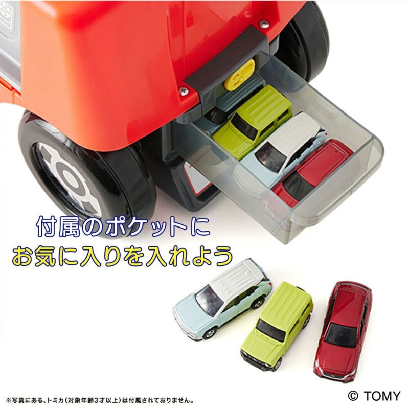 得意気にトミカを動かして、気分は憧れのピットクルー。さらに4台のトミカを収納できるボックス付きで、お片付けも楽々!