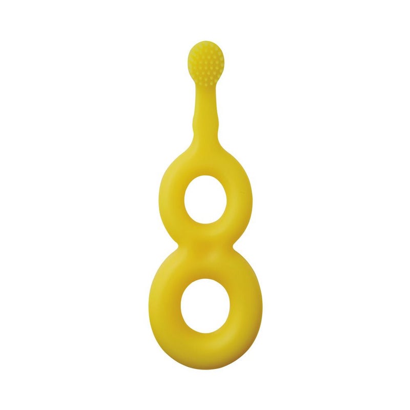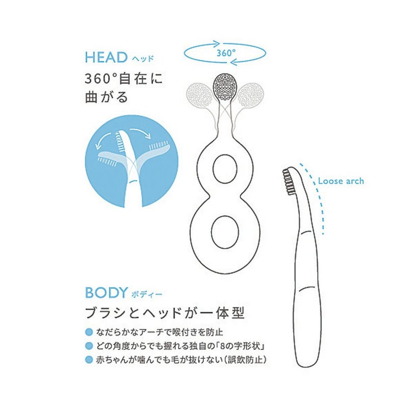 やわらかく360°自在に曲がるヘッド。なだらかなアーチで、のど突き事故が起きにくい形。 8の字形状はお子さまがどの角度からも握りやすいです。 毛が抜けにくく誤飲を防ぎます。 お子さまが使いやすいように考えられた設計。