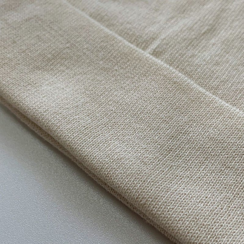 育児工房のオーガニックコットンベビー帽子です。 100年以上前の機会でゆっくりと編まれた希少な伝統素材「吊天竺」を使用しているので、空気をたっぷり含んだ優しい肌ざわりが特徴。伸縮性も高いので、まだ柔らかい赤ちゃんの頭にもぴったりフィットして、守ってくれます。
