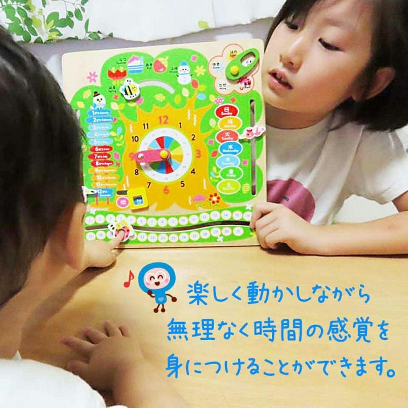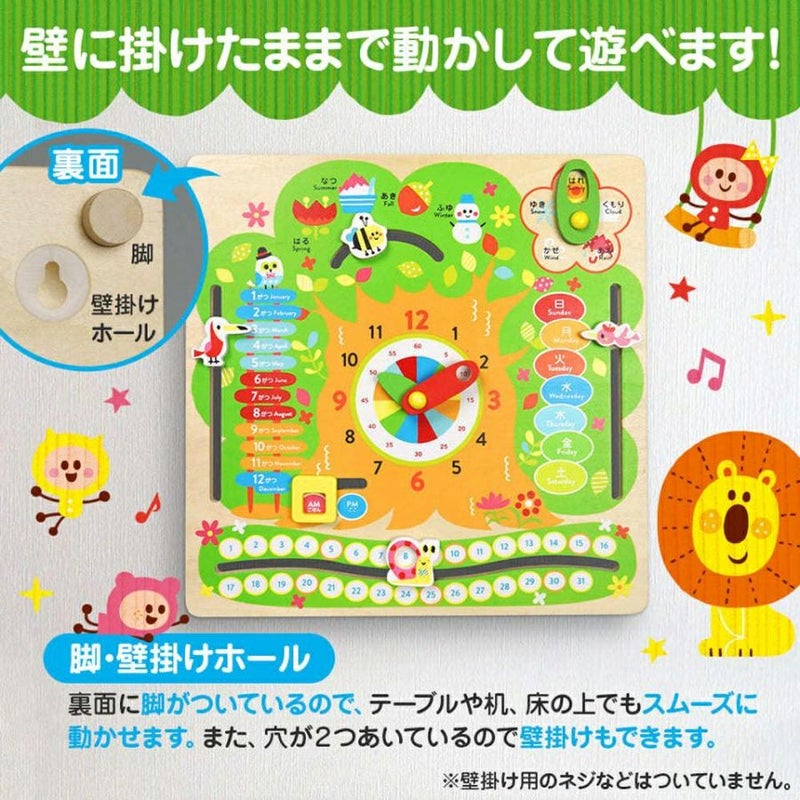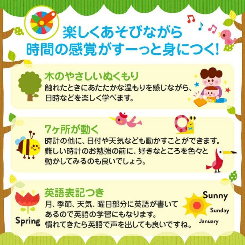 「時計、午前/午後、月、日、曜日、天気、季節」を親子でコミュニケーションをとりながら楽しく学ぶのにもぴったりな、やさしいぬくもりを感じる木製の知育玩具です。