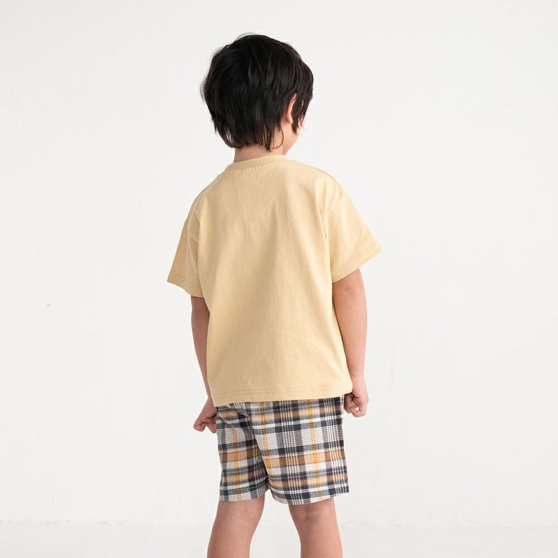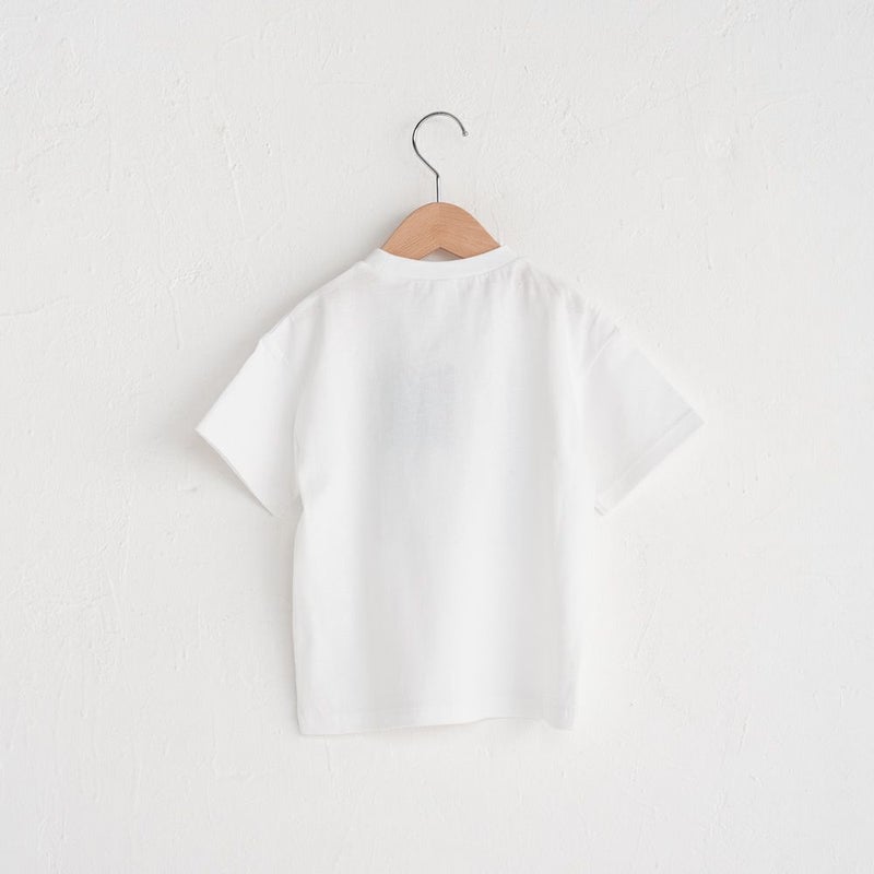 サッカー生地ならではの軽やかな表情が爽やかなアップリケ×英字プリントの5分袖Tシャツ。