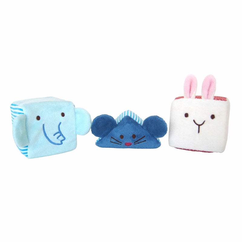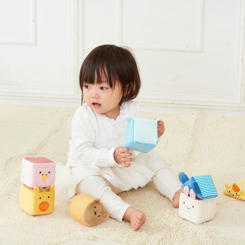 はじめてのおもちゃにぴったりなやわらかい布のつみき。ひとつひとつのつみきから音が鳴るので、ラトルと して単体で遊んだり、いないいないばあやごっこあそびを楽しめるのはもちろんのこと、ひっぱる、つかむ、 にぎる、転がすなどの動作を通じて、様々な感覚を養うことができます。
