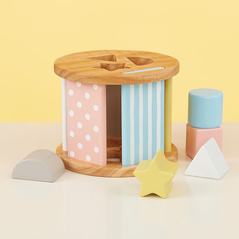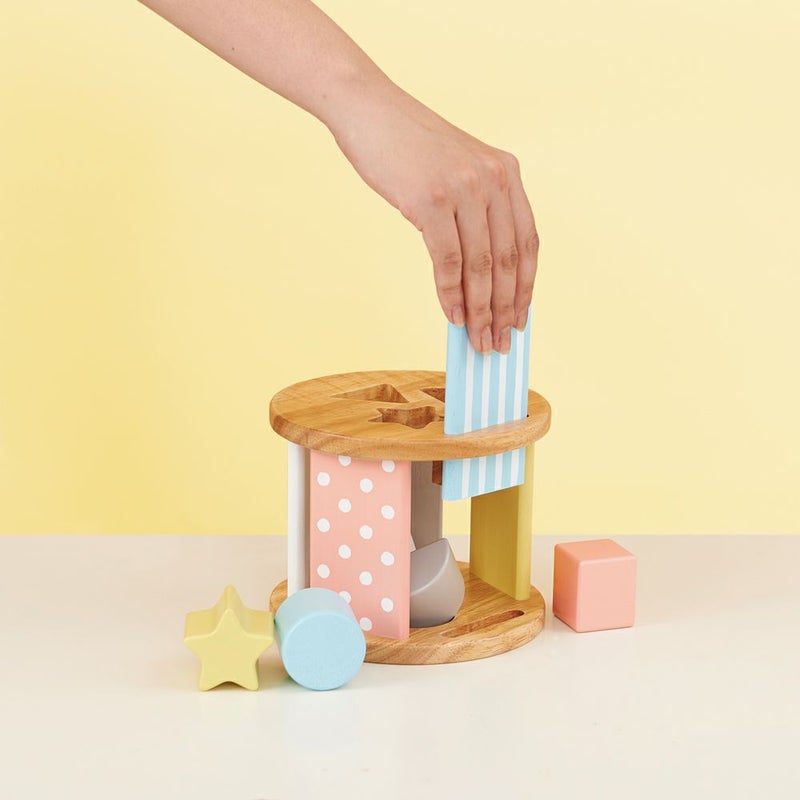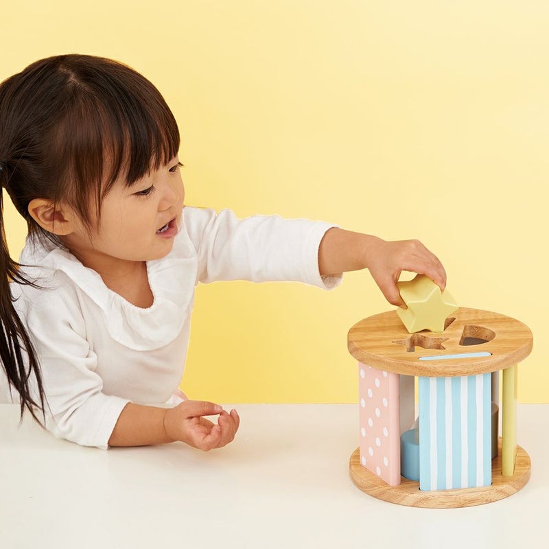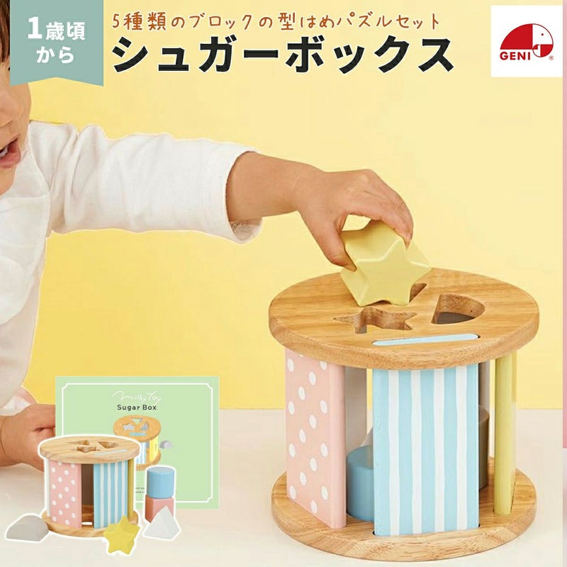 やさしい色合いのボックスと5種類のブロックで遊ぶ、型はめパズルセット。ボックスの穴に同じ形のブロッ