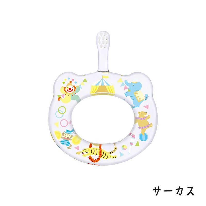 リング型のフォルムは、子供が万一ハブラシをお口に入れたまま走り回っても、のどまで届かないよう設計されました。また、赤ちゃんの小さな手でも握りやすく、薄くフラットな形状なのでママが仕上げ磨きの際にも持ちやすくなっています。やわらかい毛を使用し、さらに1本1本の毛先を丸く加工しているため、生えはじめの繊細な歯肉にやさしい磨き心地です。ヘッド部分を小さく、毛の長さも短く設計してあるので、奥歯までしっかり磨けます。