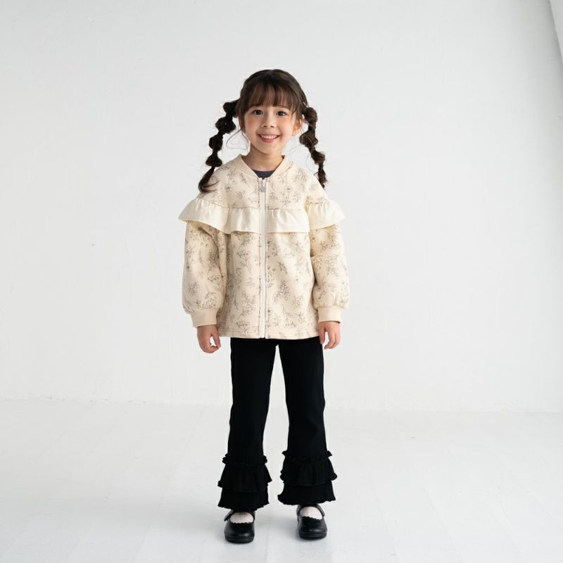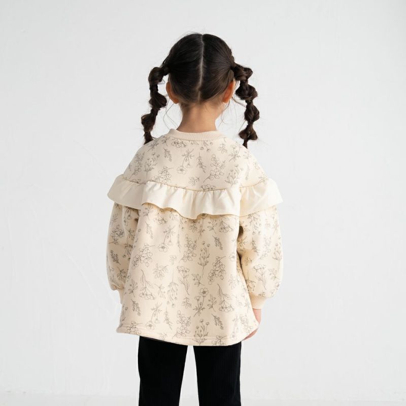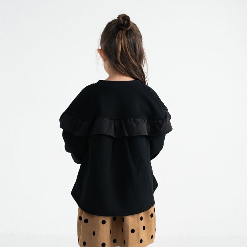 ラウンドヨークにあしらった異素材フリルがさりげなく女の子らしさを演出。裏毛起毛素材であたたかく、袖ロはリブ仕様で風を通しにくいのも嬉しいポイント。通園通学やお出かけにびったりな、デザイン性と機能性を両立した1着です。