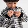 ボタンは開閉が簡単になっているのでお子さん自身で着用しやすく、袖口はリブ仕様で、手を洗うときも腕まくりが楽チン♪