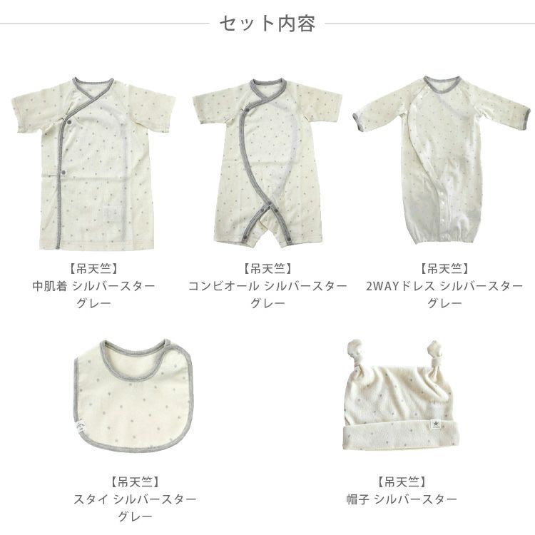 オーガニックベビーウェアブランドikujikoubo(育児工房)で1番人気柄「シルバースター」の5点セットです。ほんのりキラキラした小さなお星様は、赤ちゃんをかわいく見せてくれるデザイン。出産準備に欠かせないアイテムをが1点ずつ入っています。