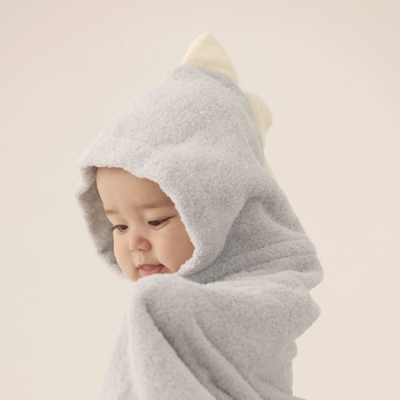 フード付きでボタンを留めるだけのバスタオルは、体温調節が苦手な赤ちゃんにサッと被せてあげられて、とっても便利!