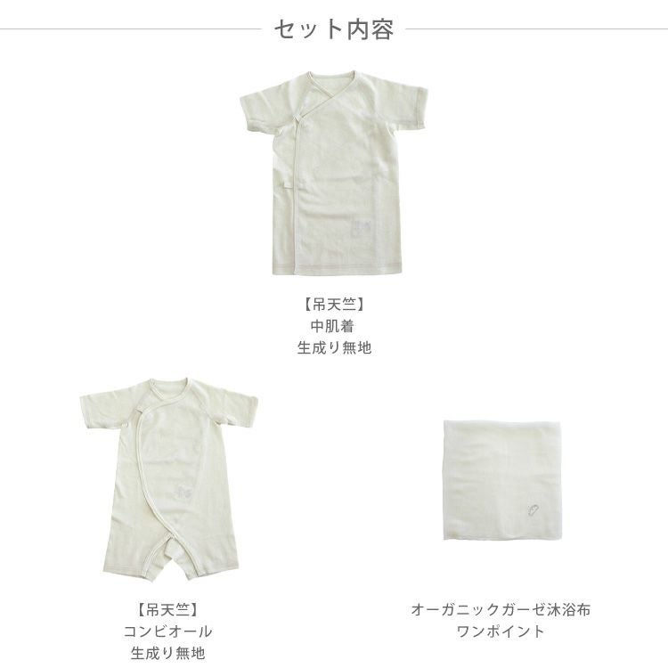 「吊天竺(つりてんじく)」という伝統素材を使った、空気をたっぷり含んだ優しい肌ざわりのオーガニックコットンの肌着のセットです。 空気を多く含むことで「夏涼しく、冬暖か」という肌の温度調節機能も果たしてくれる素材です。 「コンビオール」はお股が立体的でスナップ付。合わせが深く、足の動きが活発になってもはだけず、着崩れしにくいアイテムです。1枚でも着用できます。 快適さや不快さを言葉にできない赤ちゃんの肌着には、「きもちいい」と感じられるものにこだわりたいという ikujikoubo(育児工房)の想いの込められたアイテムです。