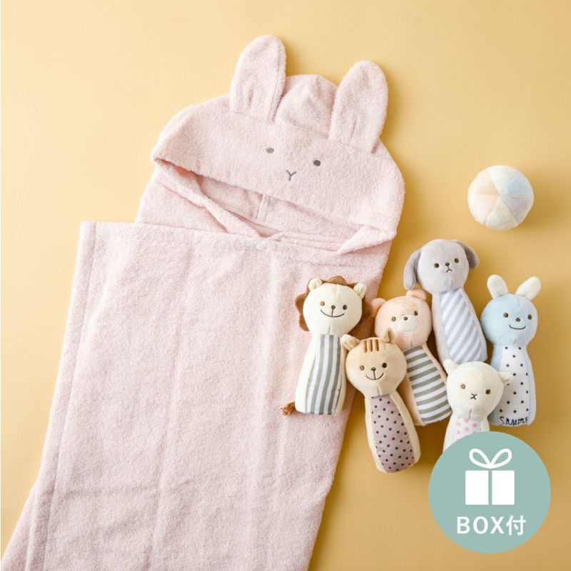 ピンやボールに鈴が入っていて、転がしたり振ったりするとやさしく軽やかな音がなる布おもちゃと、綿100%でどうぶつモチーフがたまらなくかわいいフード付きバスタオルのセット。