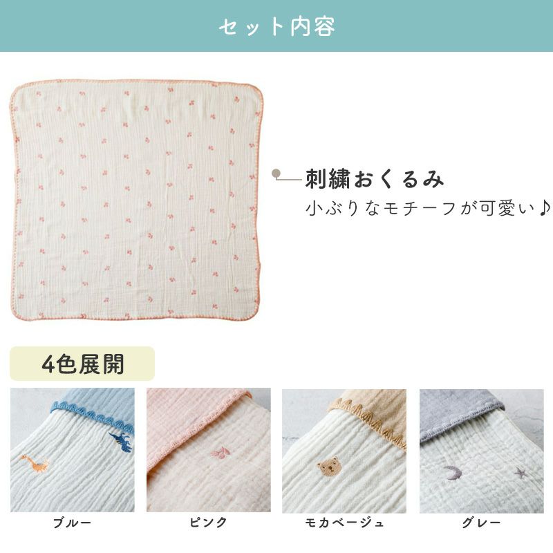 表はガーゼ、裏はパイル生地でできた、ふわふわ感とやさしい肌触りの日本製ハンカチ。