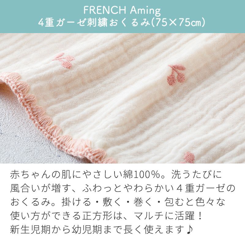 赤ちゃんの肌にやさしい綿100%。洗うたびに風合いが増す、ふわっとやわらかい4重ガーゼのおくるみ。掛ける・敷く・巻く・包むと色々な使い方ができる正方形は、マルチに活躍!