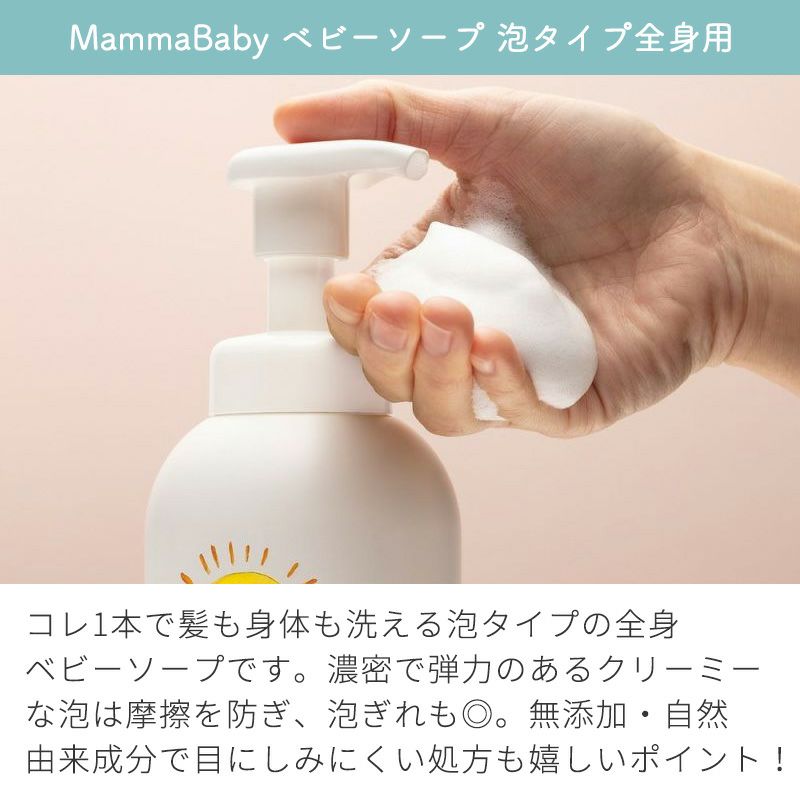 コレ1本で髪も身体も洗える泡タイプの全身ベビーソープです。濃密で弾力のあるクリーミーな泡は摩擦を防ぎ、泡ぎれも◎。無添加・自然由来成分で目にしみにくい処方も嬉しいポイント!