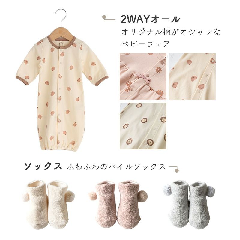 赤ちゃんの発育に合わせてドレスとカバーオールの2通りに使い分けられます。
