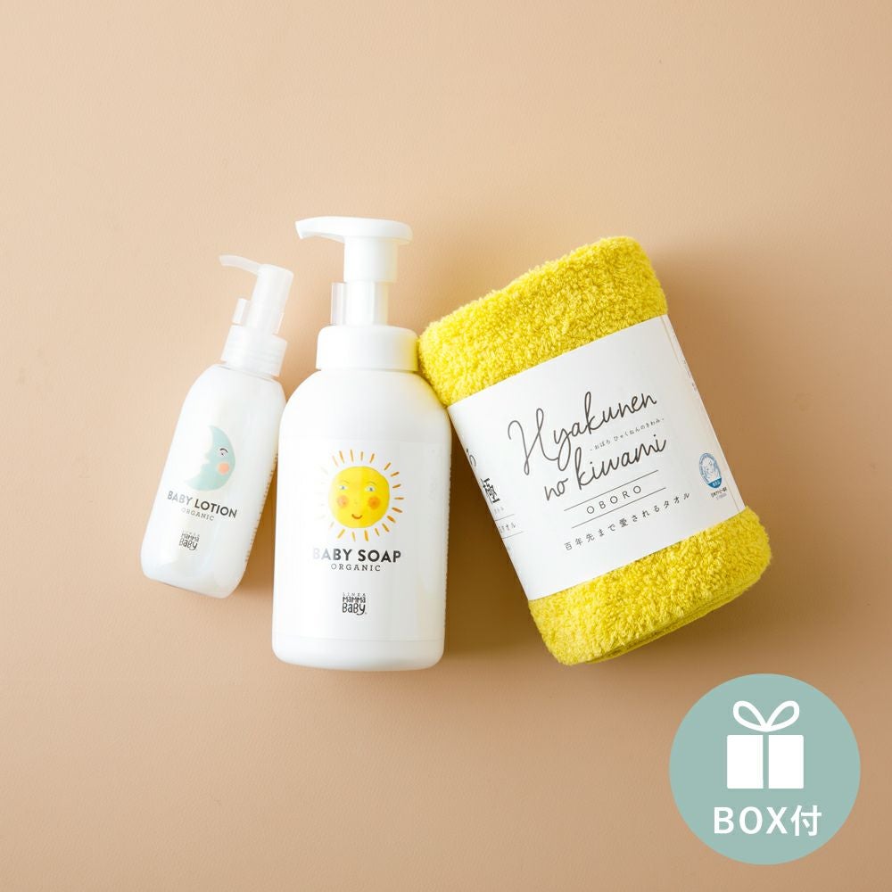 他の画像を見る 「育児本」プレゼント対象 おぼろタオル 百年の極フェイスタオルとMammaBaby(ママベビー) ベビーローション&ソープ 【ギフトボックス入り】/Amingオリジナルセット ¥ 6,270 税込 お気に入りに登録する
