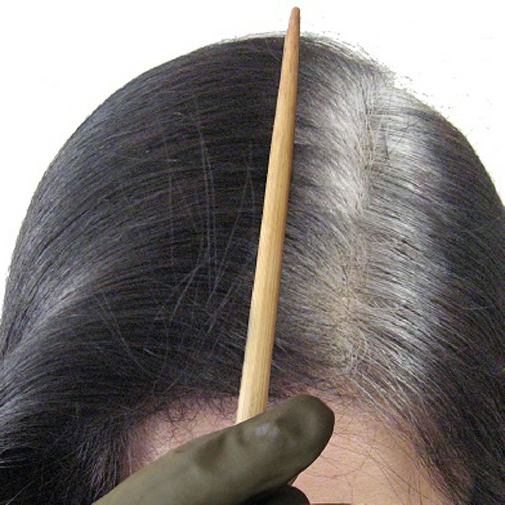 ③乾いた髪の真ん中に、さい箸を使ってまっすぐ分け目をとります。ハケでペーストを塗ります。必ず根元の白髪部分のみに塗るようにしましょう。