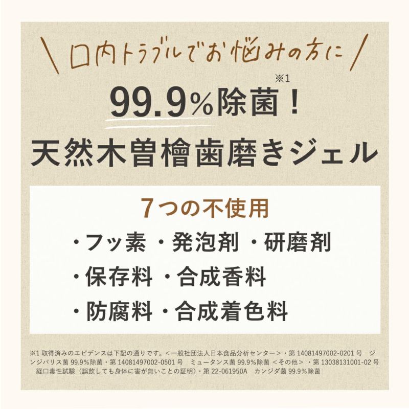 ※1取得済みのエビデンスは下記の通りです。 <一般社団法人日本食品分析センター> ・第14081497002-0201号 ジンジバリス菌 99.9%除菌 ・第14081497002-0501号 ミュータンス菌 99.9%除菌 <その他> ・第13038131001-02号 経口毒性試験(誤飲しても身体に害が無いことの証明) ・第22-061950A カンジダ菌99.9%除菌