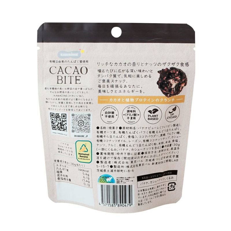 バナナピューレ、有機オーツ麦、有機たんぱくパフ、ココアパウダー、黒糖、てんさい糖、有機ココナッツオイル、レーズン、有機ココナッツチップ、カシューナッツ、クルミ、有機えんどう豆たんぱく粉、米粉、米油、食塩