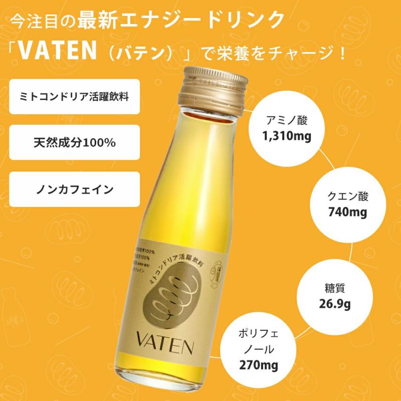 健康と密接に関係するミトコンドリアに着目し、細胞・身体機能に有用な米発酵由来の栄養成分を高めた、天然成分100%のノンカフェインドリンク「VATEN(バテン)」の10本セット。