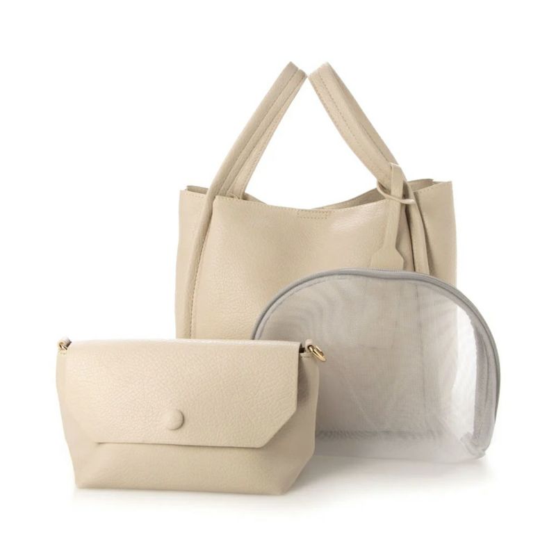 お出かけに便利なサイズのショルダーバッグとメッシュのポーチがセットになったバリュアブルなトートバッグです。