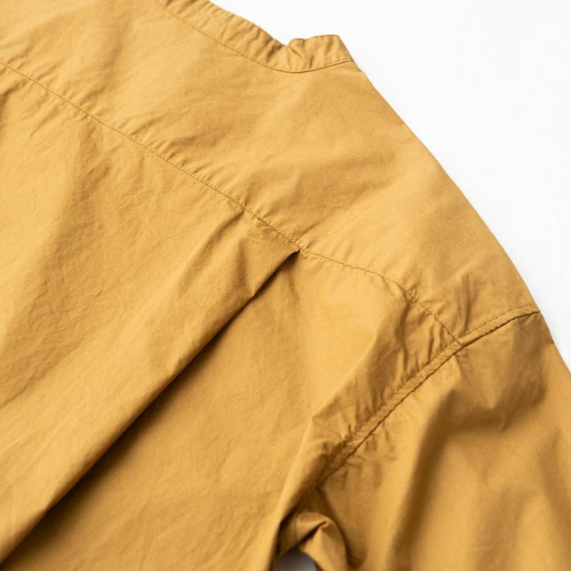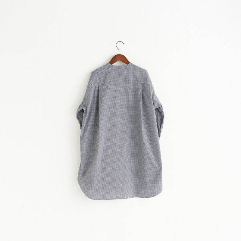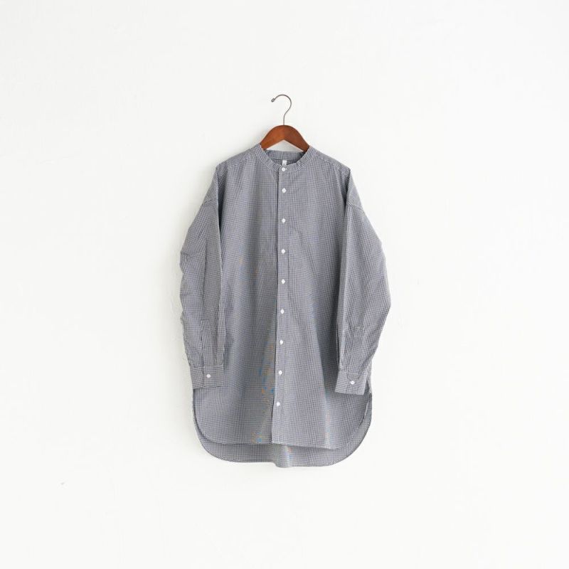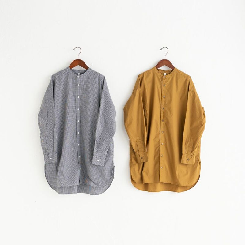 定番のスタンドカラーチュニックシャツ。ニットやベストと重ね着しやすいサイズ感。