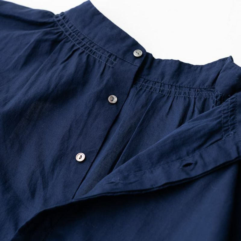 衿ぐりと、肩に大きくギャザーを入れたワンピースです。前は比翼開き仕様にしていますので、1枚着としても着用可能です。