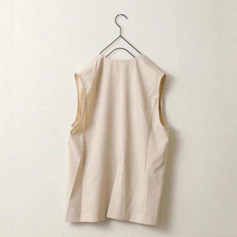 縦長シルエットがすっきり見えするノーカラージレ。