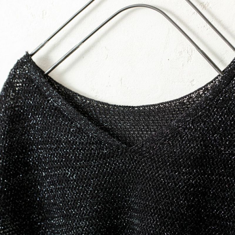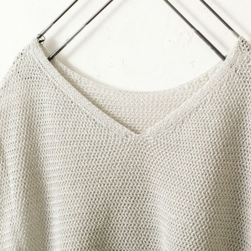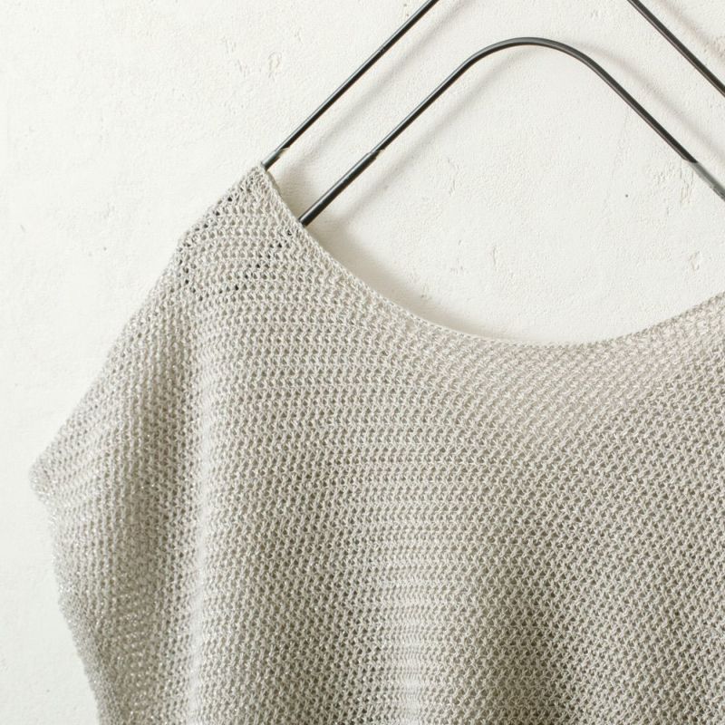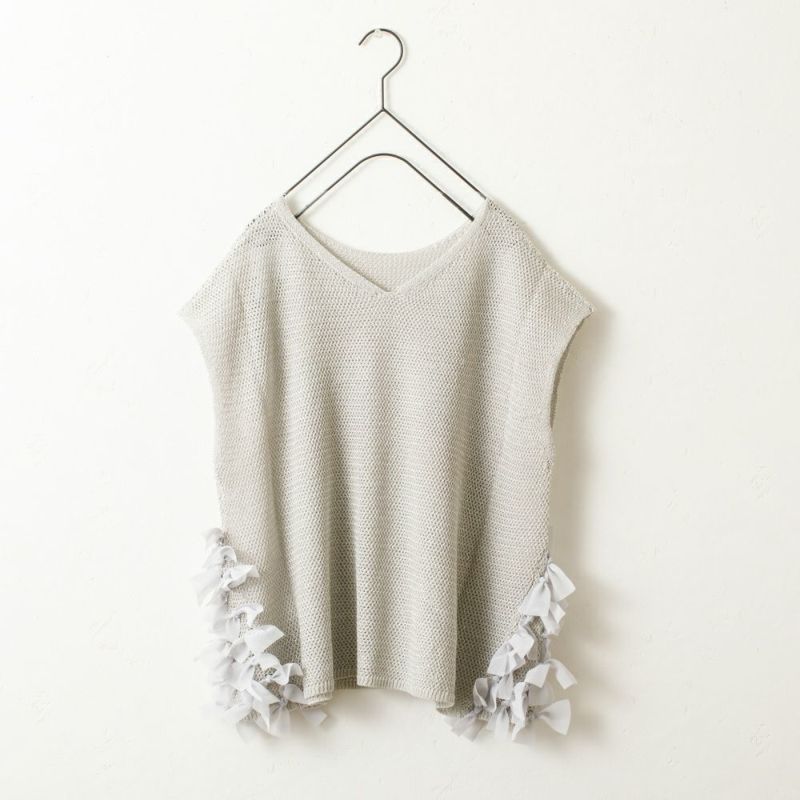 少しシャリ感のある涼し気な糸を使用したノースリーブ。サイドに施されたシフォンのリボンが軽やかな印象。