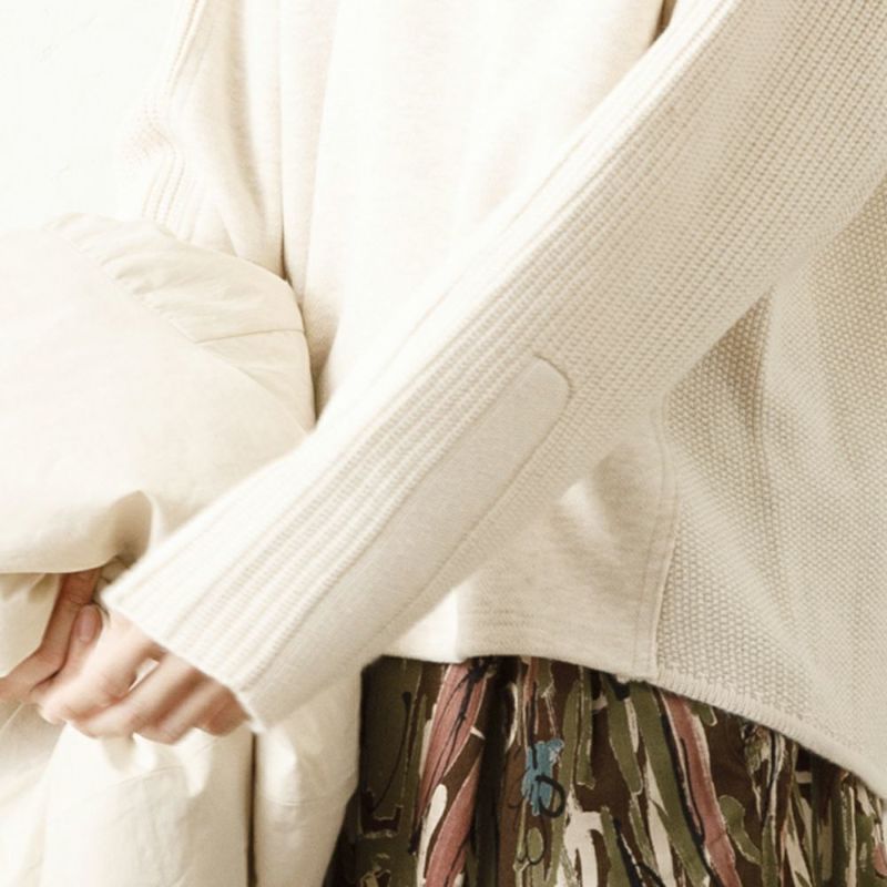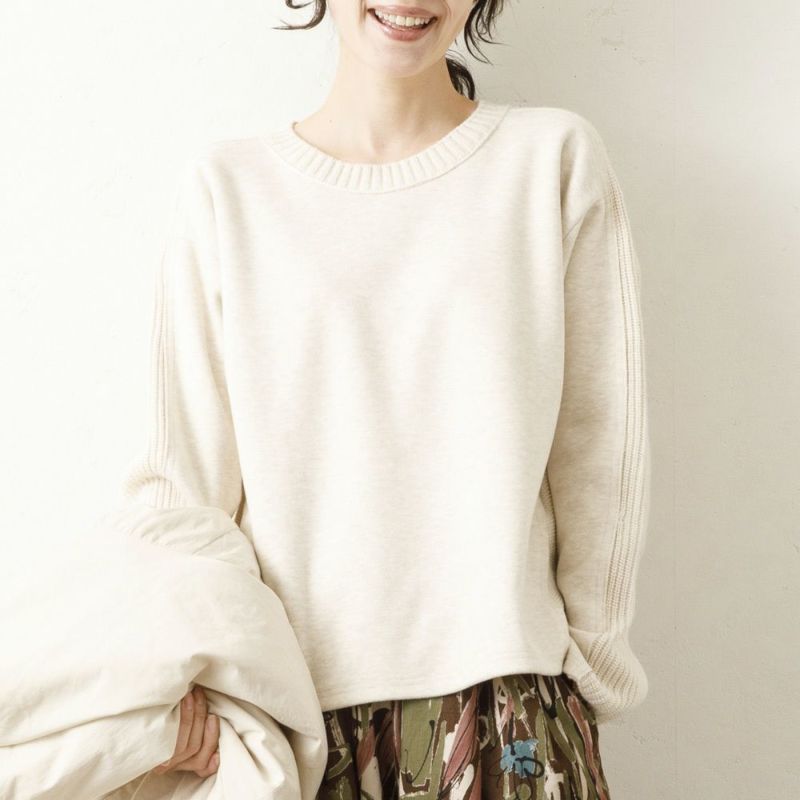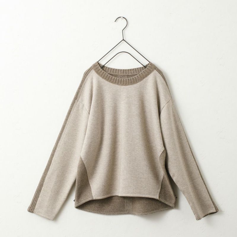柔らかな微起毛のヘリンボン柄カットソー素材とニットを組み合わせたドッキングプルオーバー。