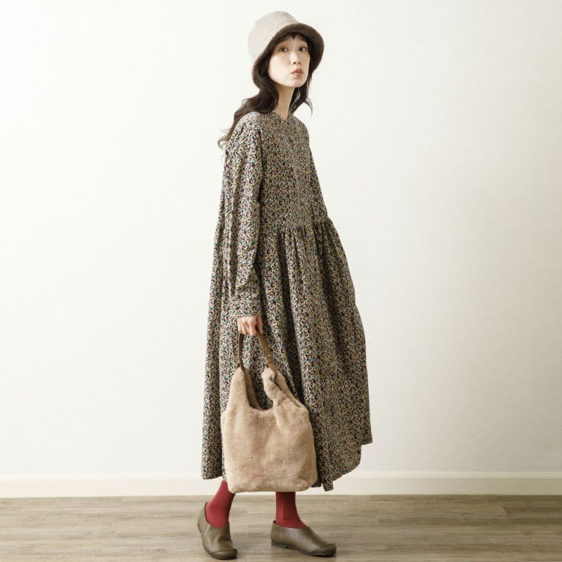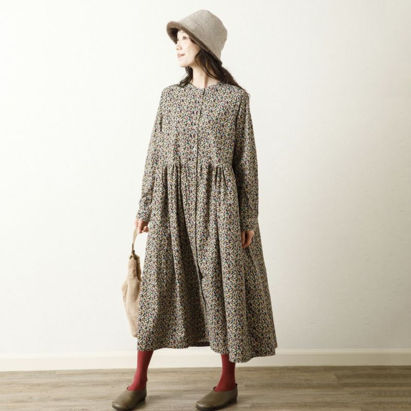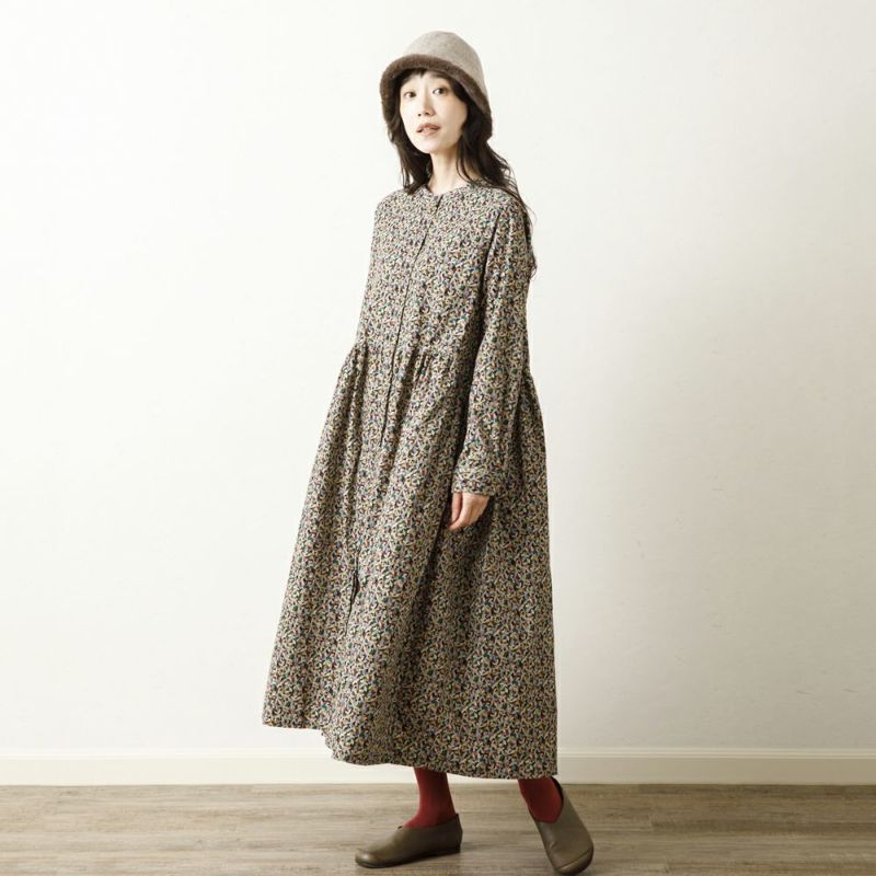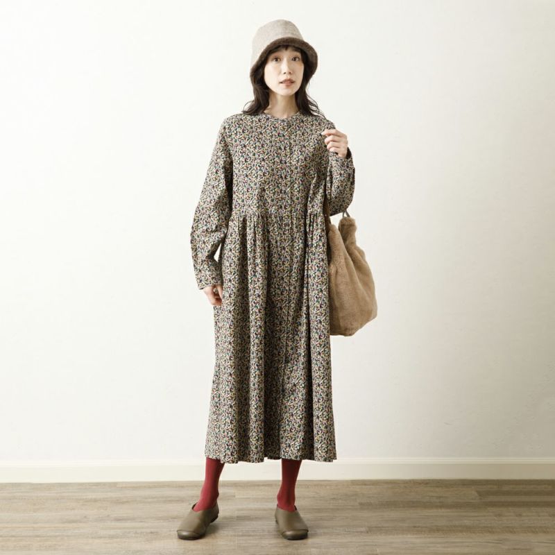細畝コーディロイの総柄プリント起毛生地を使用し、しなやかでやさしい肌触りのウエストギャザーがほどよい甘さを漂わせるバンドカラーワンピース。