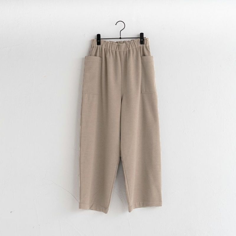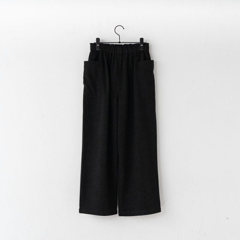 ウール混のほどよく厚みのある柔らかな生地。伸縮性もあり着用しやすい生地です。両脇に大きなポケットが特徴。ウェスト総ゴムで履きやすいアイテムです。