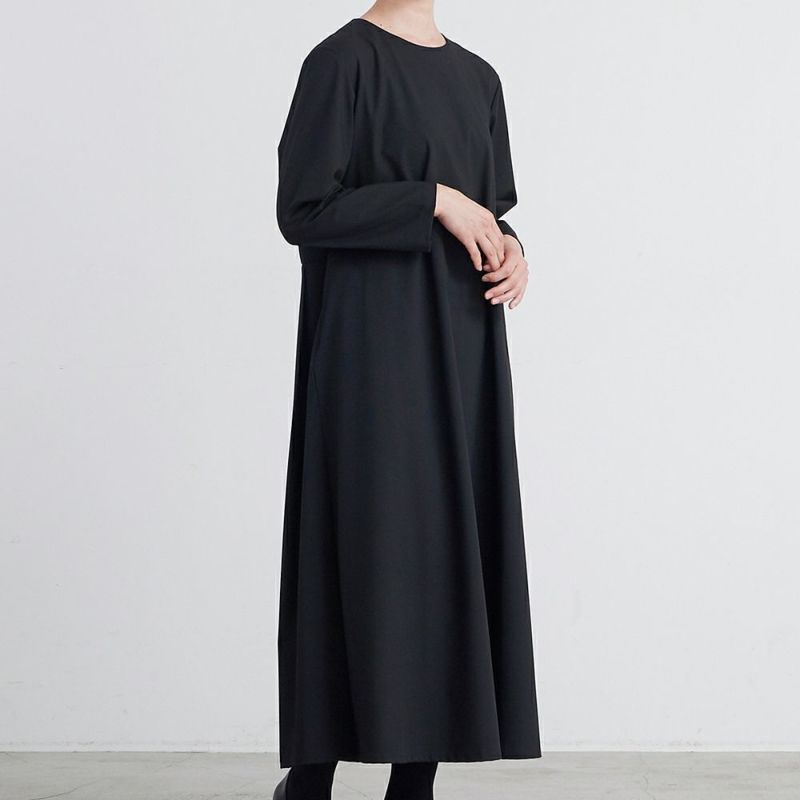 程よくハリがありしなやかな風合いで毛羽が少なくクリアな表面感が特徴の生地。裾に向かってふんわりと広がるAラインシルエットに、後ろスカート部分には裾に向かって自然と消すプリーツを入れ、歩くとふんわりと広がって美しいシルエットに仕上がりました。